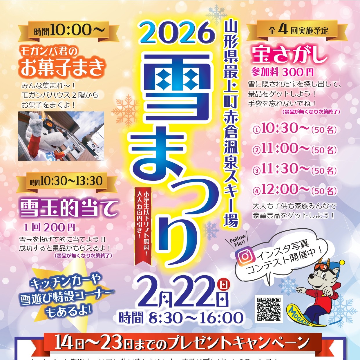 赤倉温泉スキー場で、家族で楽しめるイベントが盛り沢山! 21日(土)&22日(日)&23日(月)は「スペシャルファミリーデー」リフト券が大人500円引き&小学生以下無料で、お得にスキーが楽しめます。皆様お誘い合わ…