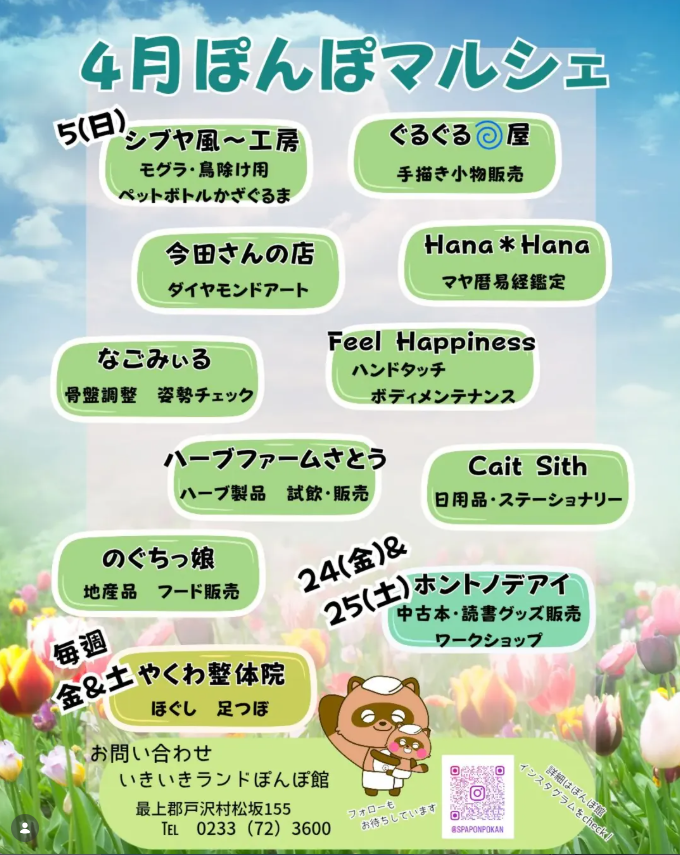 カイロプラクティック、クラフト販売、ワークショップなどいろいろな出展者が月替わりで出
