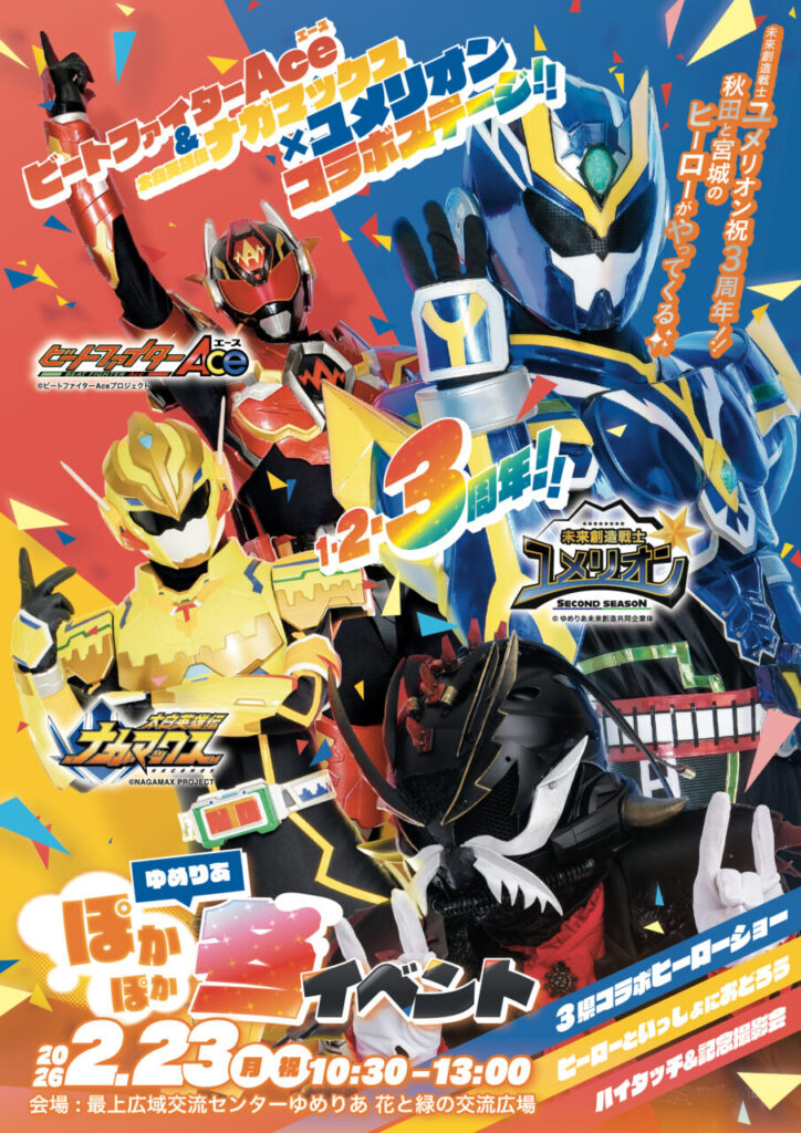 ユメリオンが誕生して3周年。秋田と宮城のヒーローもやってくる? 未来創造戦士ユメリオンセカンドシーズン!3周年特別編! 【結成!悪徳・雨田ズーン帝国?!~願いのサクランボを探せ~!】 みんなでヒーローショーを楽しもう! その他、体を動かすダンスの時間もあります。