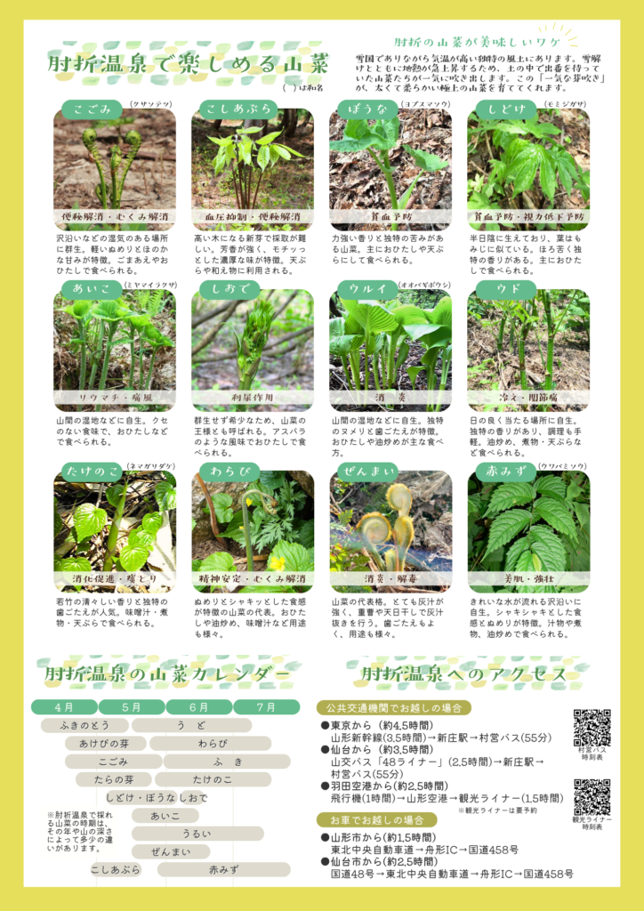 - 期間中は各旅館にて、自慢の山菜料理が提供されます。源泉かけ流しの肘折温泉郷。湯に身をまかせ、山をご馳走に。「山菜づくし」のご馳走を心ゆくまでご堪能ください。
