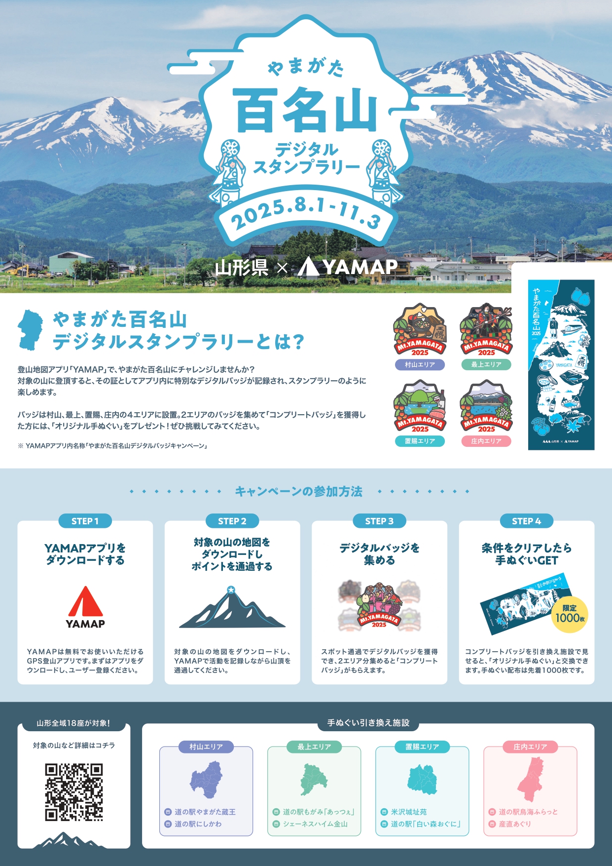 バッジは村山、最上、置賜、庄内の4地域18山設置。2地域以上の山を登って「コンプリートバッジ」獲得した方に限定オリジナル手ぬぐいをプレゼント!(枚数限定)