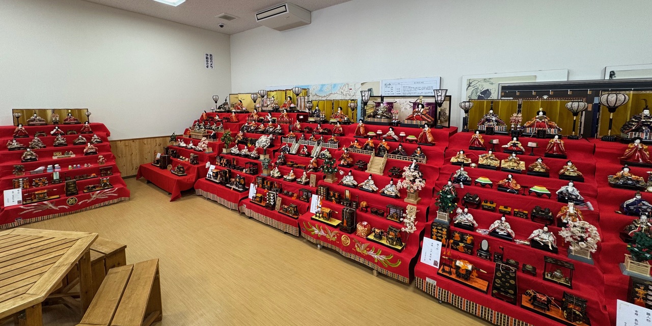 月山・葉山が一望できる絶景地にある温泉施設に、新旧のお雛様をにぎやかに飾りつけます。